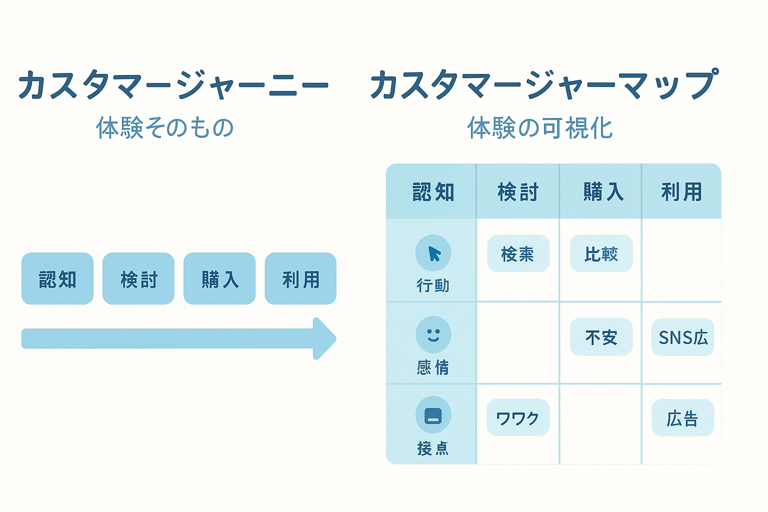 - カスタマージャーニーマップは”顧客体験“を起点に可視化したもの