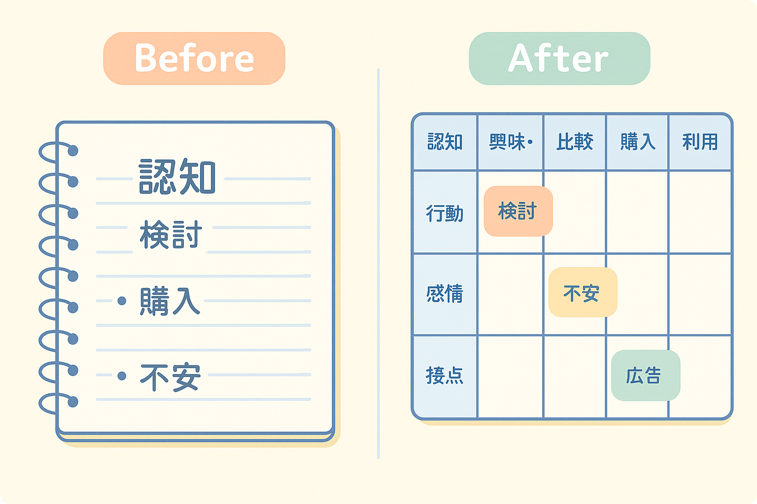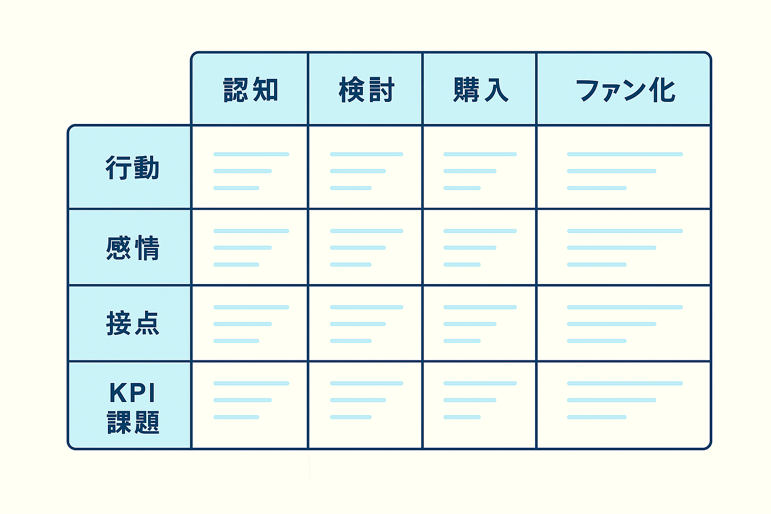 - 縦レーン(行):分析観点(感情/接点/KPI/課題・アイデア など)