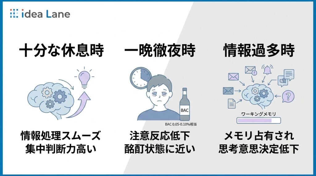 こうした状態では、思考がまとまりにくくなり、判断の質も低下しやすくなるのです。