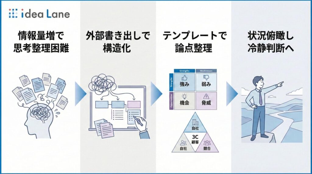 idea Laneには、戦略分析に活用されるSWOTや3Cなどのテンプレートが用意されており、断片的なメモを入力していくだけでも、検討の方向性や論点の整理を進めやすくなります。