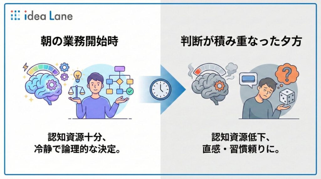 判断が積み重なった夕方認知資源が低下し、重要な選択を避けたり、直感や習慣に頼りやすくなる